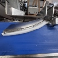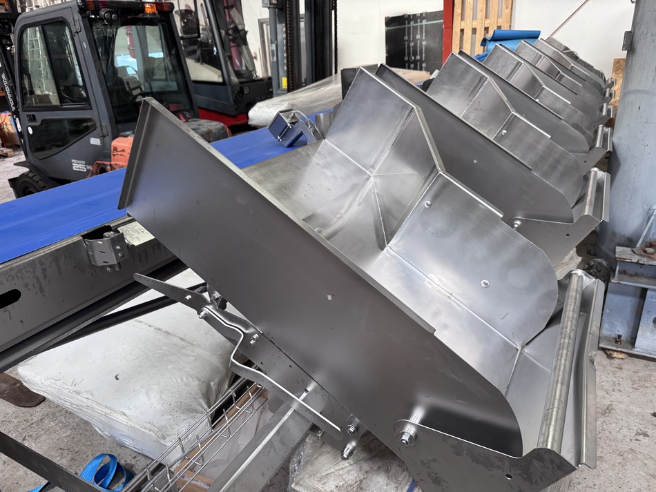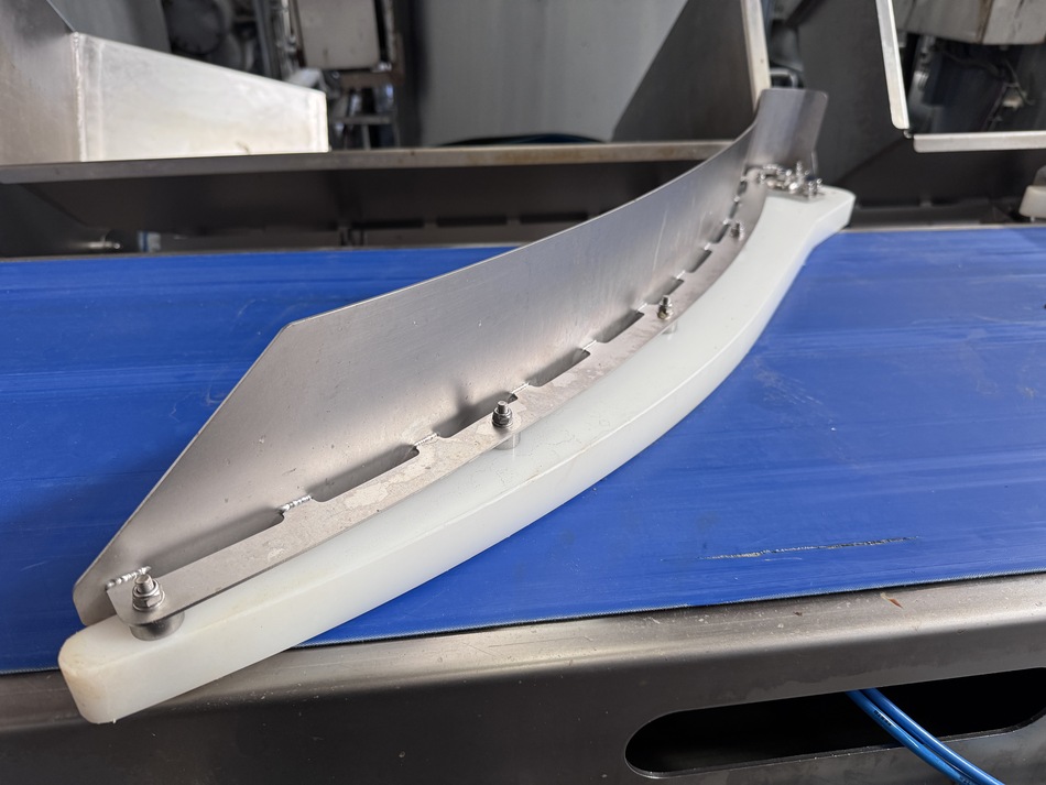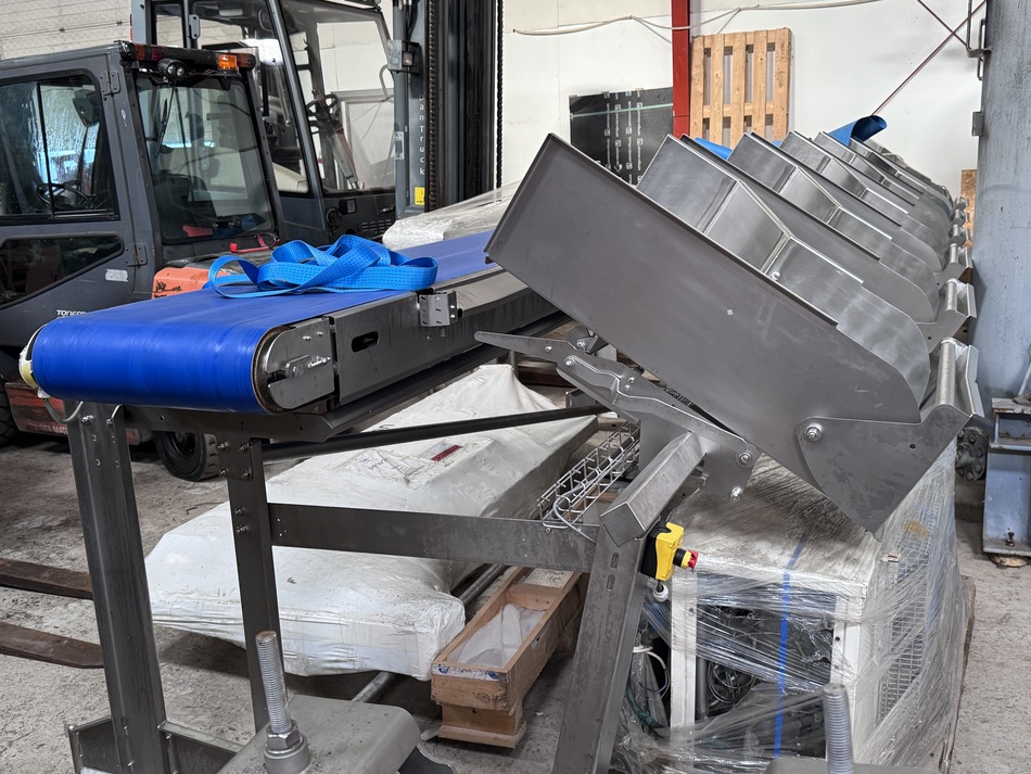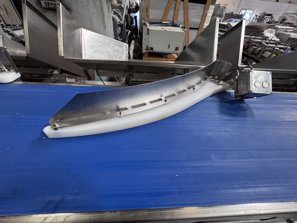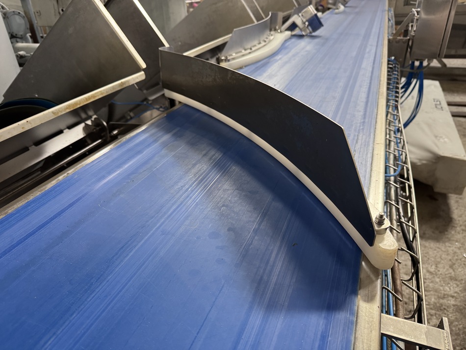 The grader has 6 channels and designed for grading of whole fish, such as cod, saithe, haddock salmon. The weighing plate length is 1000 mm and the belt width is 55 mm. The height of the reject arms is 130 mm, and the length is 800 mm. The total length of the line is 9000 mm incl. acceleration conveyor, weighing unit and reject conveyor.