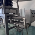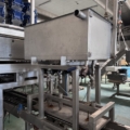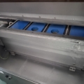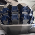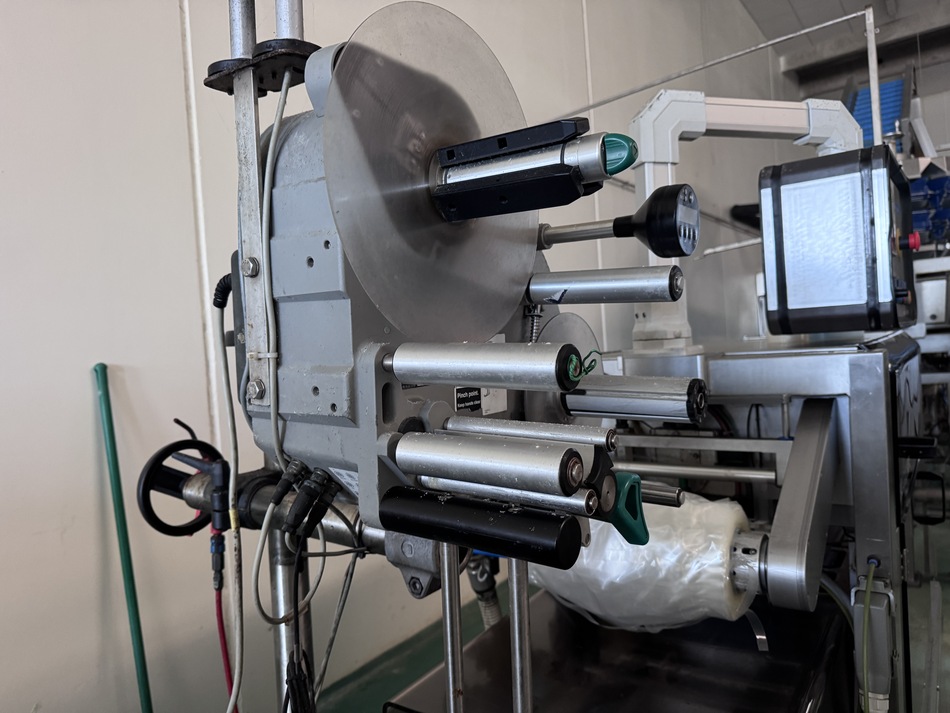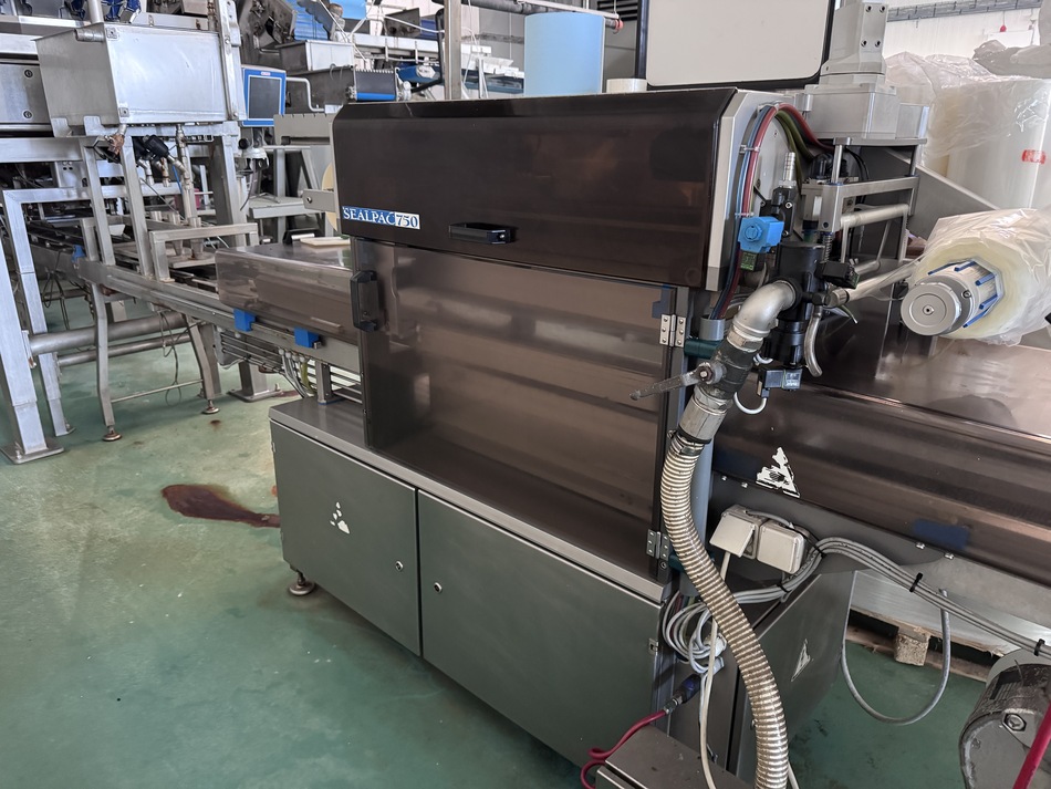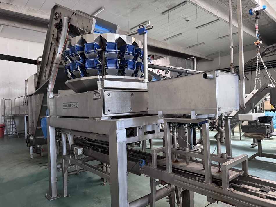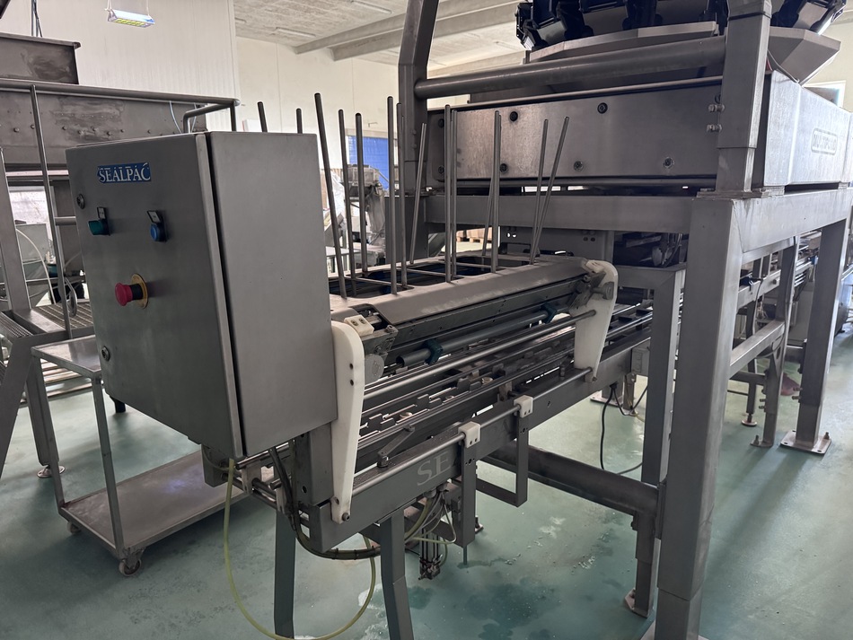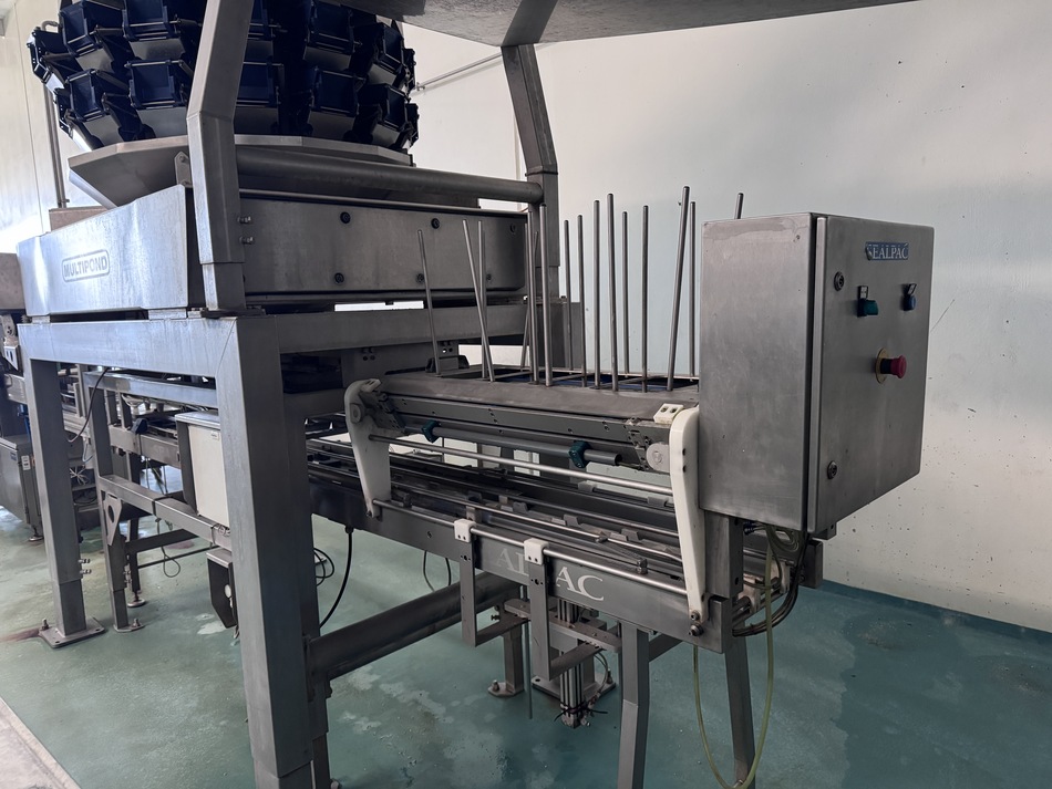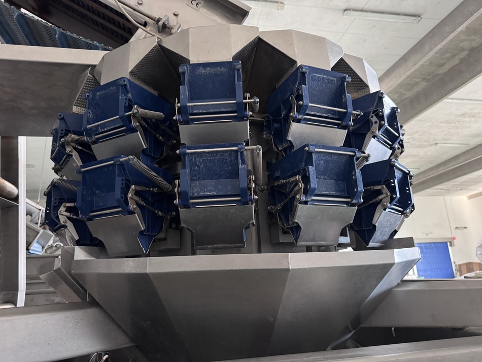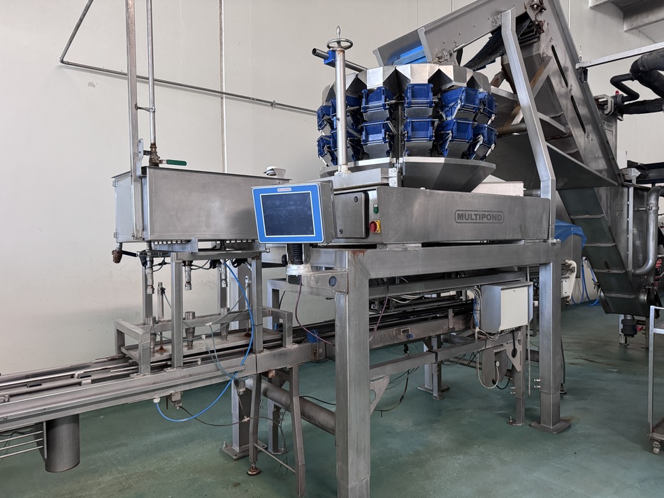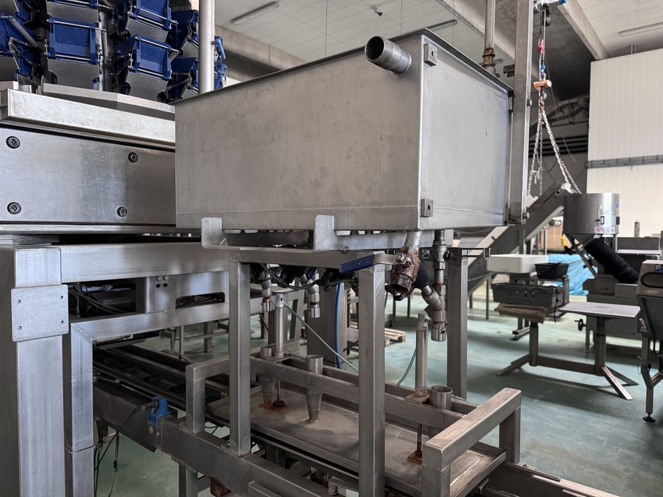 The Multipond multihead weigher type MP-14-2400-2500-H-UL does a minimum weight of 38 gram and a maximum of 2500 gram. It is water proof. The machine dumps the product into plastic trays 176 x 280 mm. From the weighing machine the trays proceed to a brine filler (can be disabled) and a Sealpac 750 with 4-in-line sealing heads. Finally, a label is being attached to the trays.
